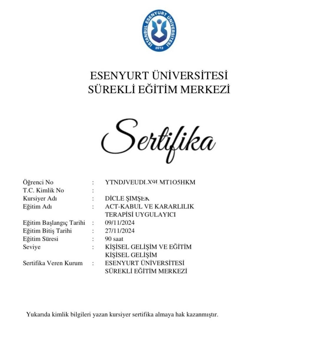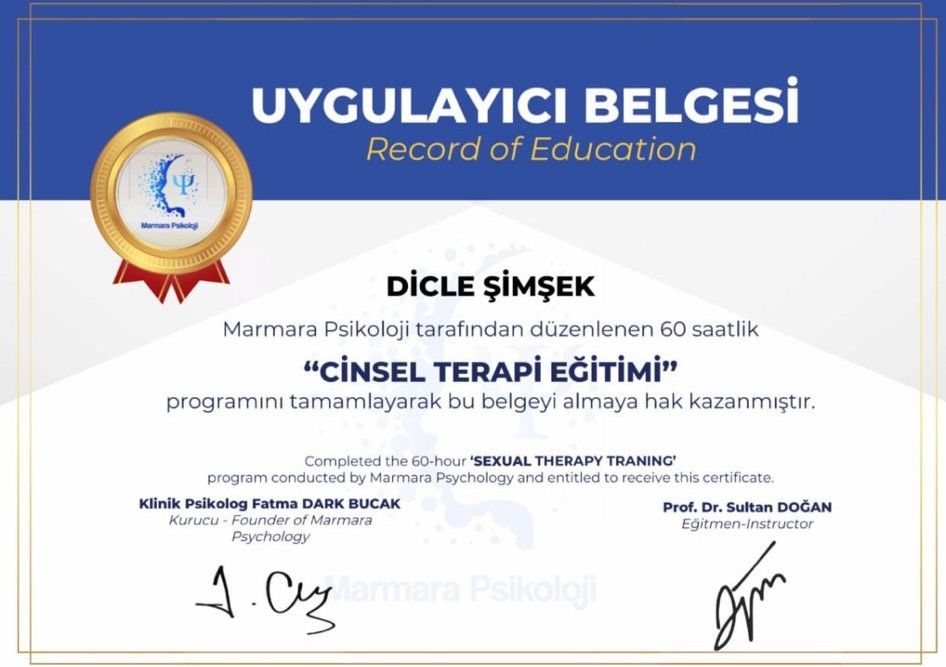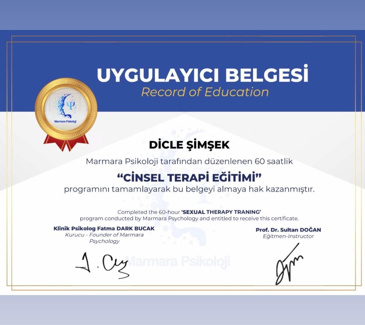 Psikolog Dicle Şimşek, Nuh Naci Yazgan Üniversitesi Psikoloji Bölümünden mezun olmuştur. Eğitim aldığı süre boyunca TMS Klinik ve Kocasinan Rehberlik Araştırma Merkezi ( RAM ) bünyesinde stajlarını tamamlamıştır. Yetişkinler için Bilişsel Davranışcı Psikoterapiler Derneğinden Bilişsel Davranışcı Terapi Eğitimi, Bağımlılık Terapisi, Aile Danısmanlığı Eğitimi, Şema Terapi ve Kabul ve Kararlık Terapisi ve Cinsel Terapi Eğitimi almıştır. Çocuk ve Ergenler için Çocuk Merkezli Oyun Terapisi Eğitimi, Çocuk ve Ergenlerde Bilişsel Davranışçı Terapi, Aile Danışmanlığı, Moxo Dikkat Testi Eğitimi almıstır. Yetişkinlerde çalışmalarına depresyon, ilişkiler, kaygı bozuklukları, panik atak, özşefkat, bağımlılık, şizofreni, dikkat eksikliği ve hiperaktivite bozukluğu, yeme bozukluğu, obsesif-kompulsif bozukluk gibi pek çok alanda devam etmektedir. Yetişkinlerde ve çocuklarda dikkat eksikliği ve hiperaktivite bozukluğu tedavisi için Moxo uygulamaktadır. Ergenlerde ve yetişkinlerde yaygın kaygı bozukluğu, panik atak, aşırı düşünme, obsesif kompulsif bozukluk, panik atak, takıntı, depresyon, ikili ilişkiler, ayrılık, öfke nöbetleri, bağımlılık özellikle çalıştığı alanlar arasındadır. Çocuklarda duygu durum düzenlemesi, sınav kaygısı çalıştığı alanlar arasındadır. Çocuk Merkezli Oyun Terapisiyle kaka tutma, alt ıslatma, akran zorbalığı, öfke nöbetler ve kardeş kıskançlığı gibi çocuklarda yaygın olarak gorulen problemlerde çalışmaktadır. Çocuklarda görülen dikkat eksikliği ve hiperaktivite bozukluğu için Moxo uygulaması ve tedavisi yapmaktadır. Ruh sağlığı alanındaki çalısmalarına psikoterapi seanslarıyla aktif olarak devam etmektedir.